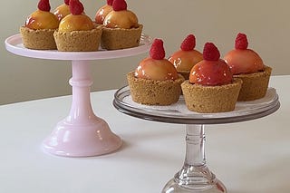 Raw raspberry coulis, amaretti cookie crusts, and glossy peaches