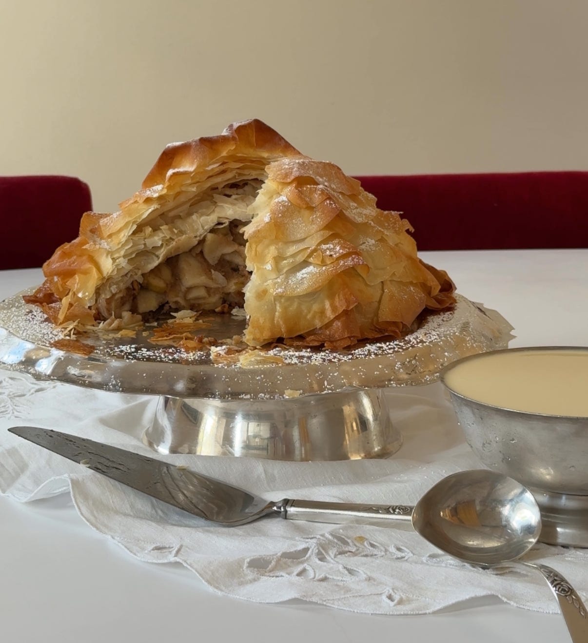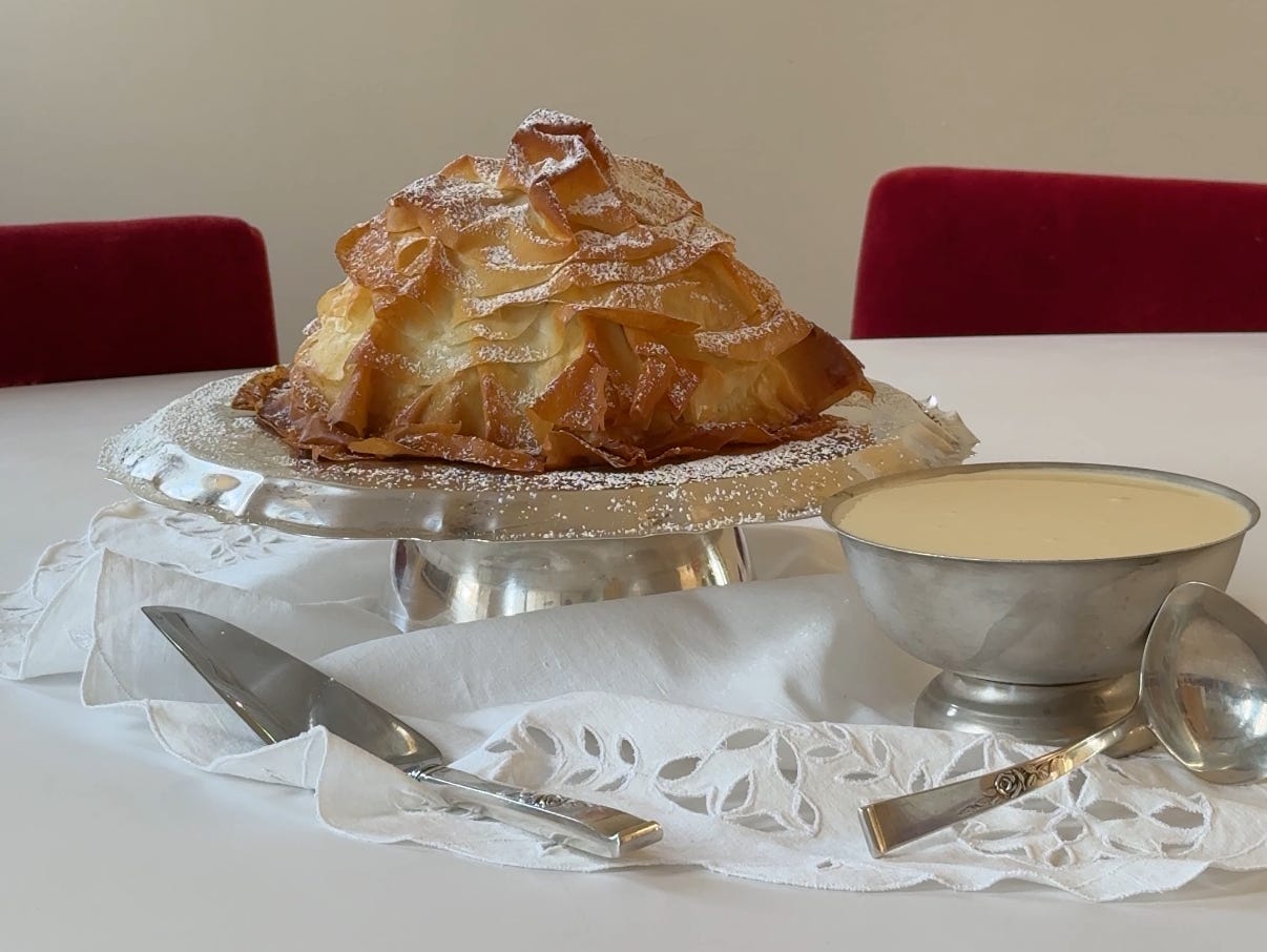 Warm spiced apples, ruffles of flaky phyllo, and a chilled crème anglaise