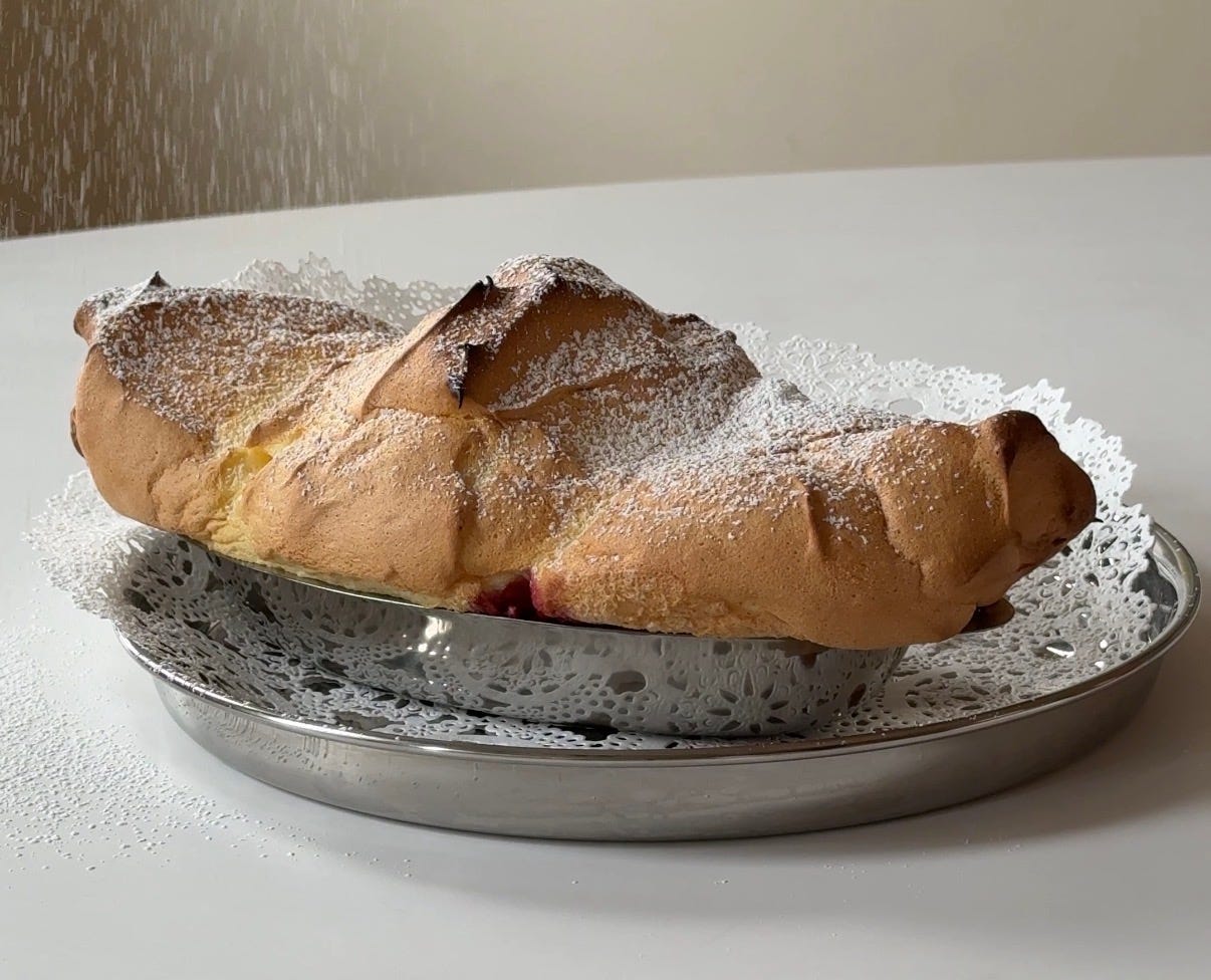 A Salzburger Nockerl is a simple soufflé made with whipped egg whites and sugar, folded in egg yolks, and a couple of dry ingredients. It is added to a baking dish over a sweet-tart jam or compote (lingonberry, cranberry, raspberry, etc.) and baked quickly in a hot oven (the compote can also be served on the side). Once baked, it gets rushed to the table (it is a very delicate soufflé), quite possibly with sides of crème anglaise or whipped cream, topped with powdered sugar, and dug into it quickly!