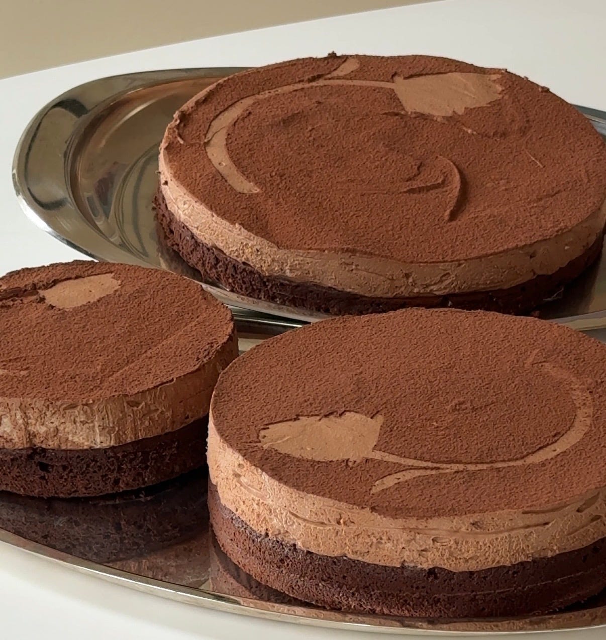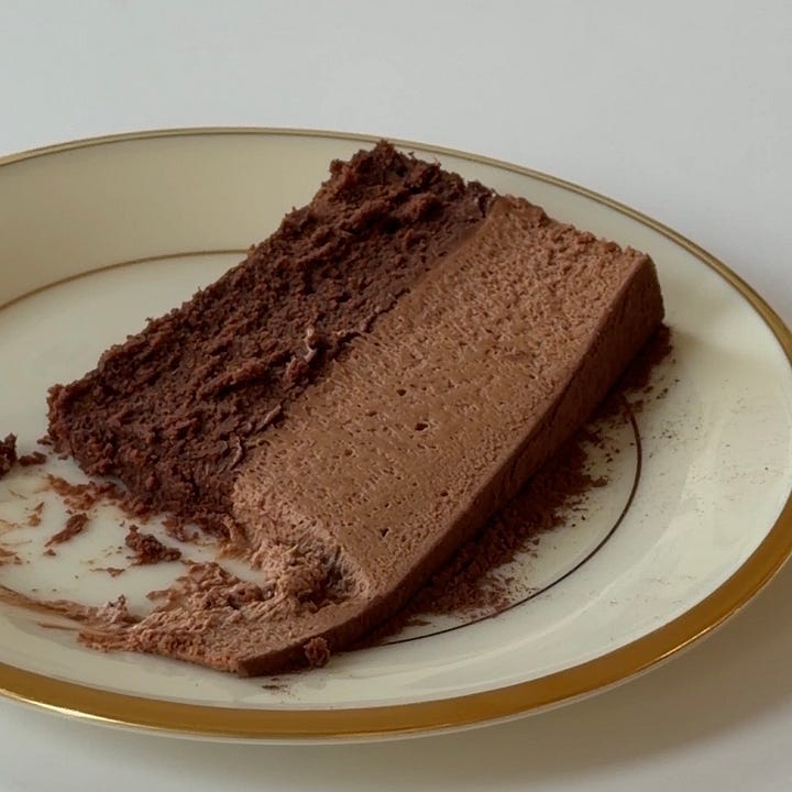 Chocolate mousse cakes are a long-time favorite of mine. The cake consists of two delicious chocolate desserts: dense chocolate cake/torte on the bottom and light chocolate mousse on top, but it is so much greater than the sum of its parts. While the flavor focuses squarely on chocolate, the two forms make for a long-lasting, nuanced, and intensely chocolatey mouthful. The two components bloom on the tongue at different rates, releasing so many layers of rich, yet varied, chocolatey aromas. I always end up eating far more of this than I would if it were solely a cake or mousse.