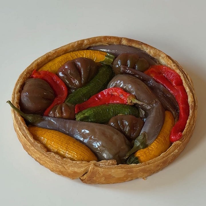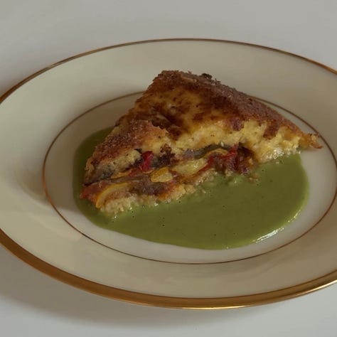 I made some tweaks this year and updated the recipe. Because the recipe makes so much, I usually need to eat some of it right away to make sure it doesn’t take up all the space in my chest freezer. I recently stuffed some tomatoes and peppers with it and served it with some olives sandwiched in between a puff pastry crust and roasted ratatouille vegetables brushed in garlic oil. It was so good that I tried stuffing it in more things: a fried polenta cake (served with basil and corn sauce), a Comte grilled cheese, an omelette.