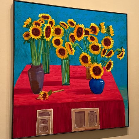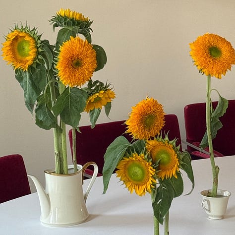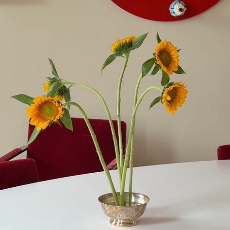 As for sunflowers, well, they just make me so happy. You can find them at the Luna Family Farm at the Union Square Greenmarket (last year they were available into November.) Some arrangements from this month are below (inspired by artwork I mentioned back in August), and I posted a few more here and one sunflower-color-themed story here .
