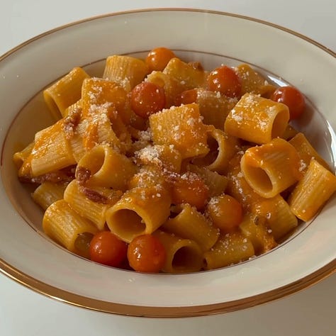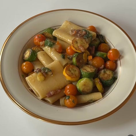 All month long, I keep them in a bowl on the bar cart, grabbing a few at breakfast, before and after lunch, and while I cook dinner. I also incorporate them into dishes, mostly pastas. I made my recipe for nduja, sungold, and corn pasta 6(!) times this summer. I also made a yellow tomato-inspired amatriciana finished with sliced sungolds (I adore the sweet and heat together), I paired them with clams to counter-balance any brininess, and I added them to a pasta with guanciale and my favorite little baby zucchinis.