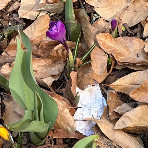 And then there was the 15th of March: I was heading home from the grocery store listening to the news–feeling pretty damn demoralized–when I spotted crocuses emerging from around the leaves and the trash in a sidewalk flowerbed. My despondence shifted to sentimentality and I cried again. The promise for renewal and growth that spring brings is a salve for the soul.