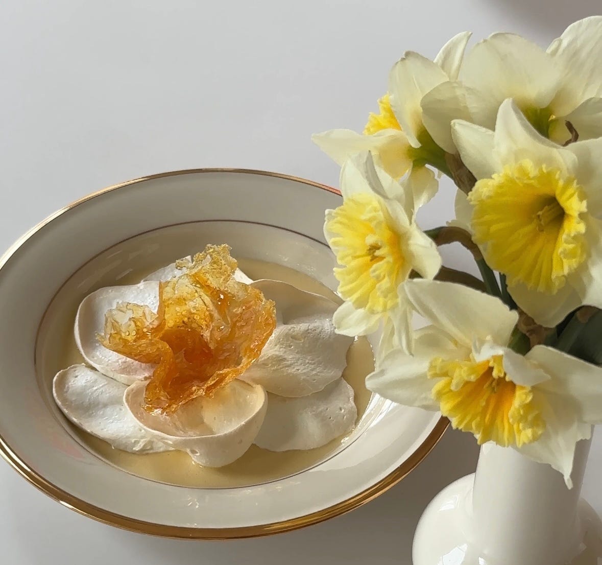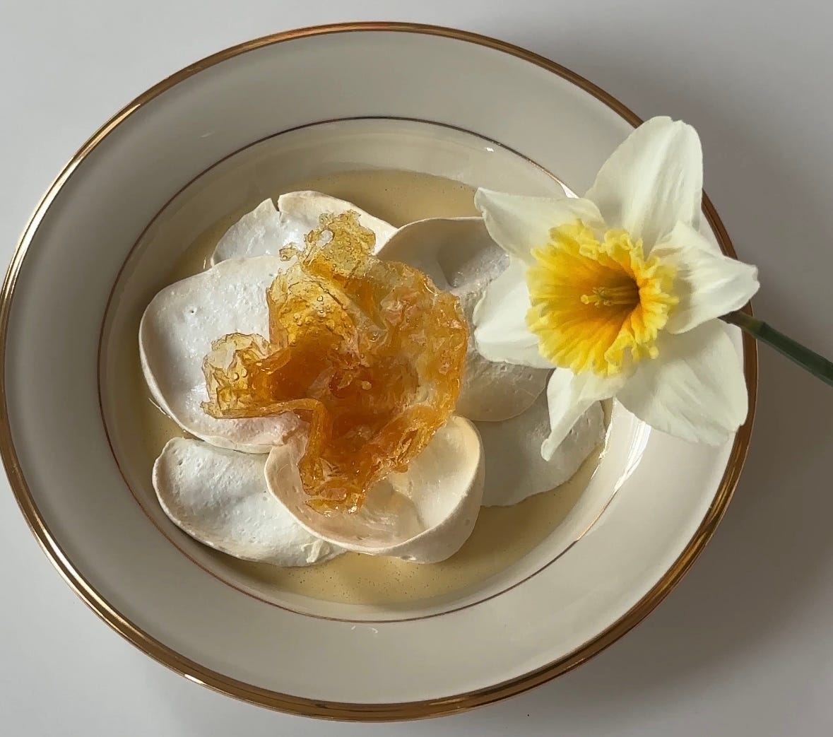 I started by making the anglaise. I used this recipe which is luxuriously yolkier than the one I usually make (I never have spare yolks so I usually use less of them, but this recipe has convinced me to indulge in the more is more mindset). I then made my trusty meringue recipe and followed the baking method in this recipe. When it came to piping the flower, I found this video to be very helpful. By no means did my end result end up looking like a daffodil, but I’m giving myself some grace considering it was my first time ever piping a flower. While the meringue baked, I made the hard caramel center. It was then time to plate it, only 90 minutes after I had started the whole thing. It was delicious. And though it didn’t make me cry, it most certainly put a smile on my face.