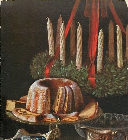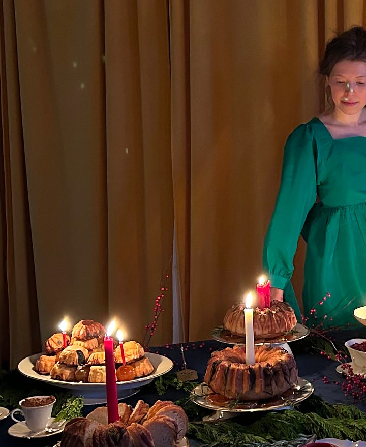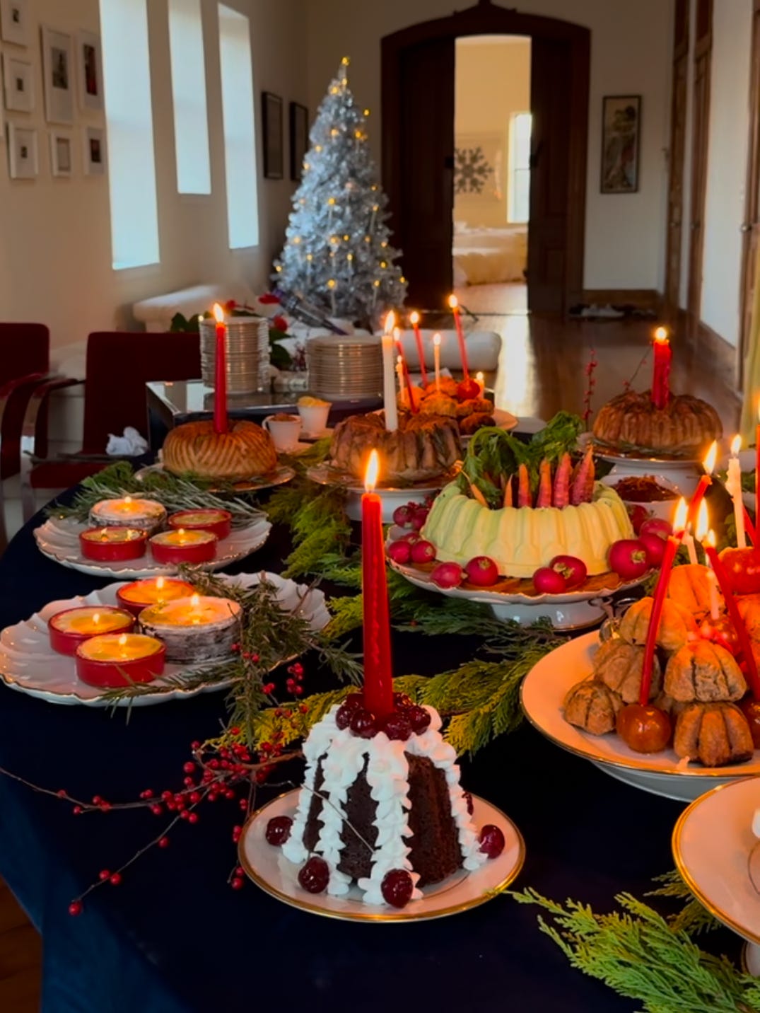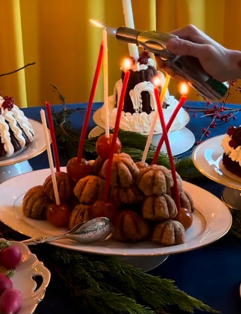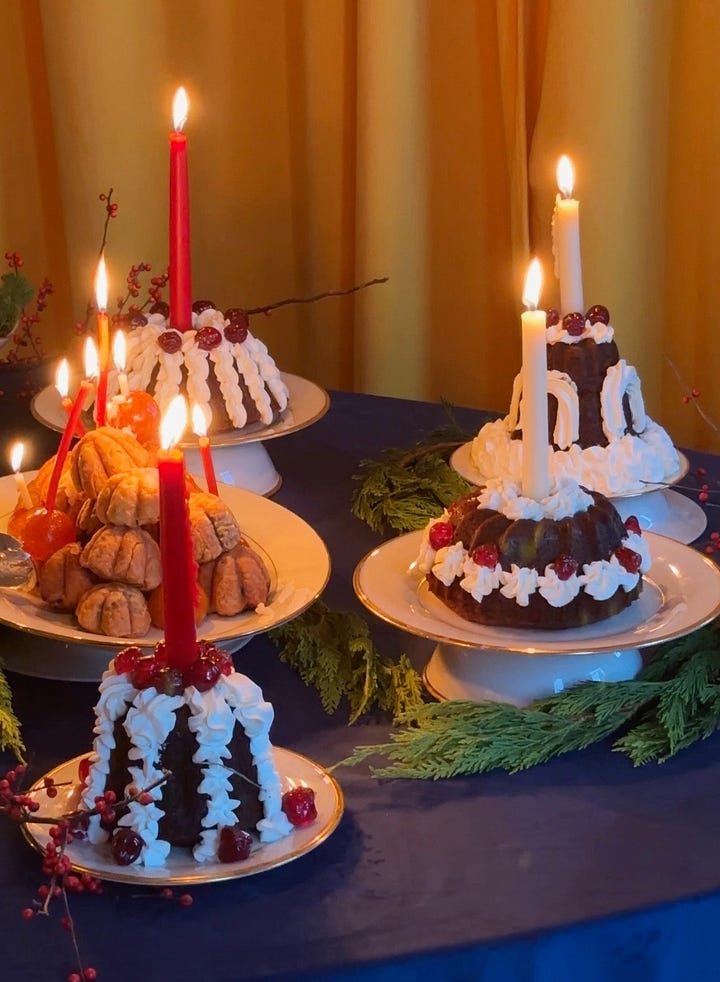 for the cakes, the shape, candles and candied fruit placement was clear. the cakes were to be baked in a bundt and decorated with piping along the indentations, a feature from my inspo that i loved. i decided i would use whipped cream stabilized with mascarpone and add candied cherries where they would visually make sense. the images also showed big candles plopped into the center of the bundt cakes, so i decided i would copy that as well placing a beeswax candle in the center of the bundt.