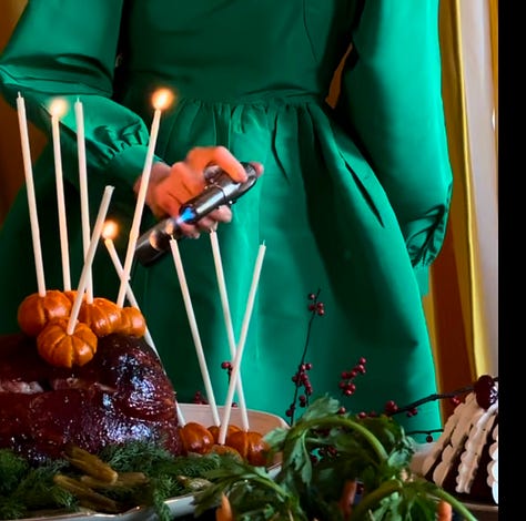 i looked at my saved photos for more clues. lots of dishes were made in bundt pans, so it was decided everything that *could* be baked in a bundt pan, would be. and every image featured candles: candles on the table, in candlestick holders, on wreaths and holly, and even in cakes. each dish would also have a candle coming out of it.