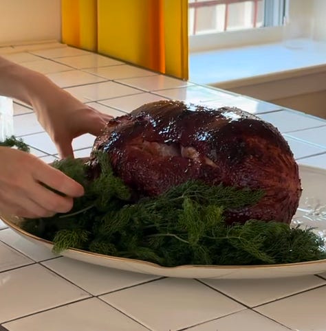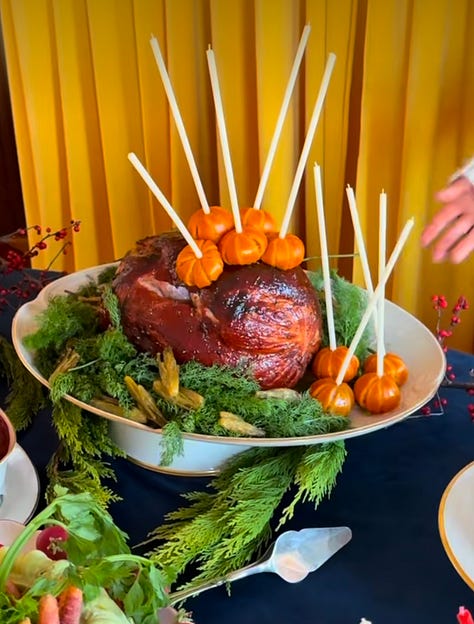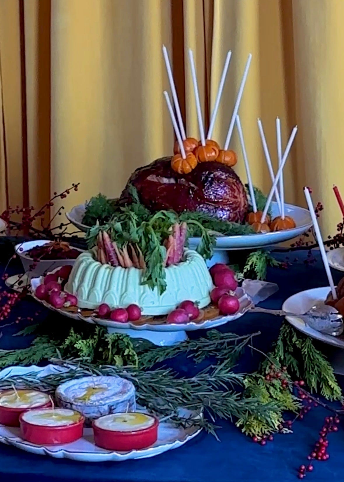 i was not even going to try to mold the ham. i’m sure someone far cooler than me has done this, but i do not have the skills or drive to try. i decided to sous vide the ham and then glaze it with a clementine and mustard and black pepper sauce. i served it with tiny roasted fennels and placed the ham atop fennel fronds (which look shockingly similar to fir branches). atop the finished ham were some demi-glazed clementines held in place by candles, inspired by the cherries coming out of last year's brooklyn blackout cake.