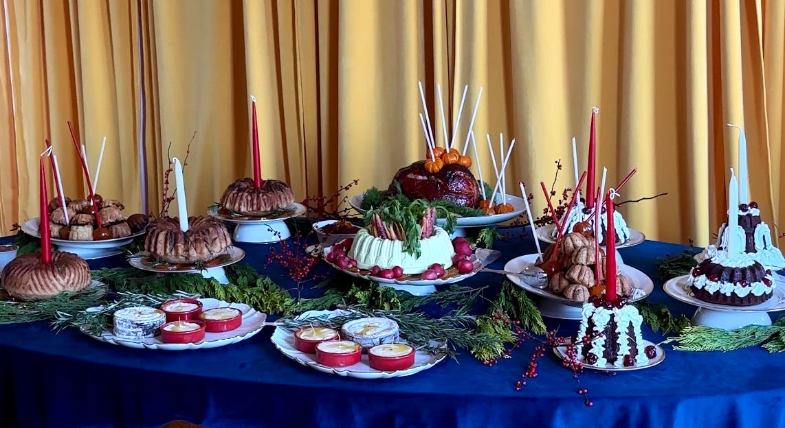 candle-ing the food, baking everything in bundt pans, and topping it all with candied fruits