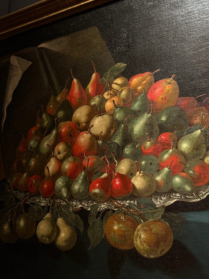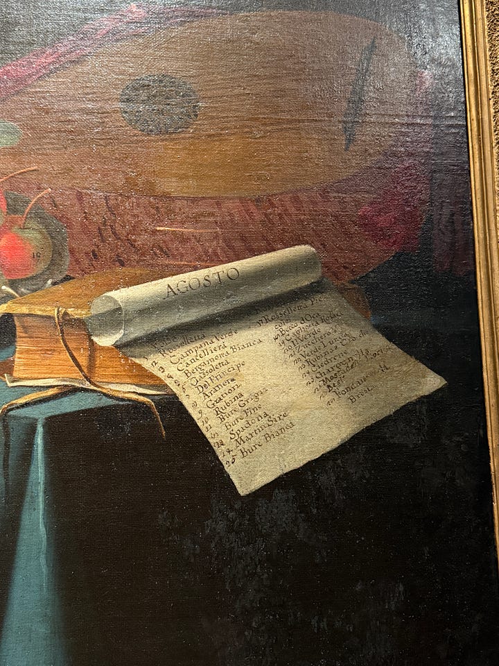 A painting of different kinds of pears ripening in August (I love their tear-drop shape and how they catch the light), numbered and named at the Capodimonte Museum.