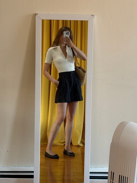 Another full Sezane outfit: a knit jumper which is a new favorite (it’s very comfortable and fits so nicely), black linen shorts that have a matching blazer (see bikini styling above), this tote that has been my go-to summer bag, and leather ballet flats