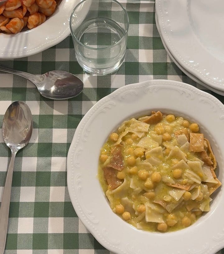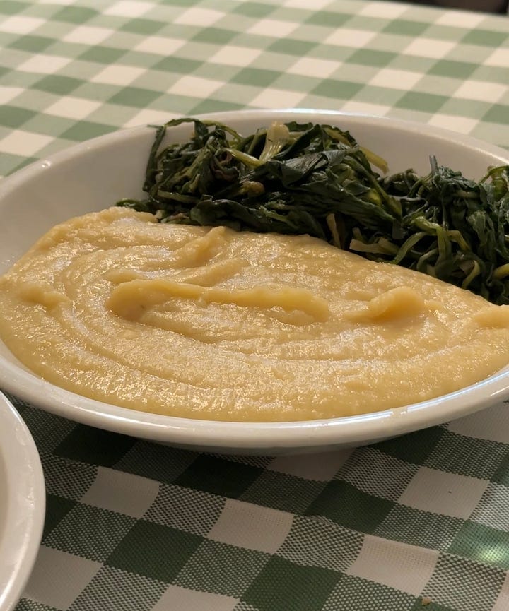 Fave e cicoria matching the tablecloth in their stripes and colors at Le Zie Trattoria. A dish I will be making all winter long. Do not miss their pasta with chickpeas if you go. The soft pasta is served with crispy chickpea strips in an unctuous and olive-oil-laden chickpea sauce with more chickpeas for texture.