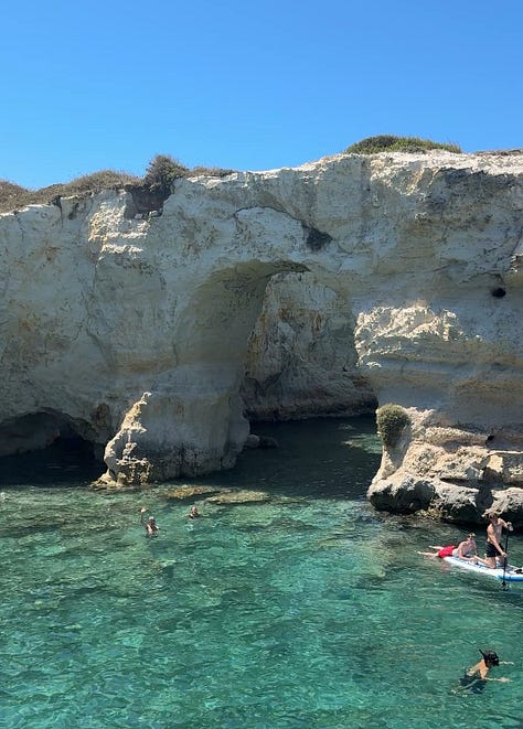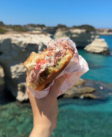 Faraglioni di Sant'Andrea. Jumping into the cool salty water, baking dry on the sun-warmed rocks, and feasting on a hearty-creamy sandwich filled with mortadella, tomatoes, buratta, and lots of olive oil.
