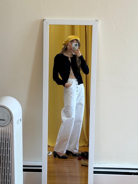 My great-grandmother’s scarf as a top, a cardigan to cover my shoulders, and a Cecilie Bahnsen skirt