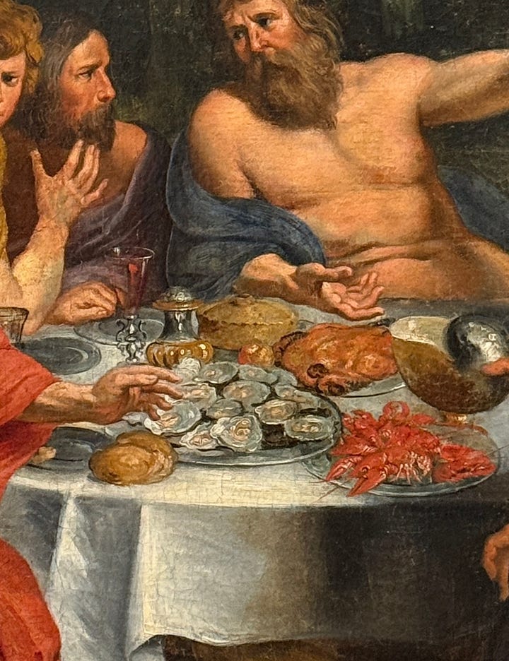 A painting of oysters and these pearl-adorned candied peaches (I guess shells are great motifs for more than just buildings).