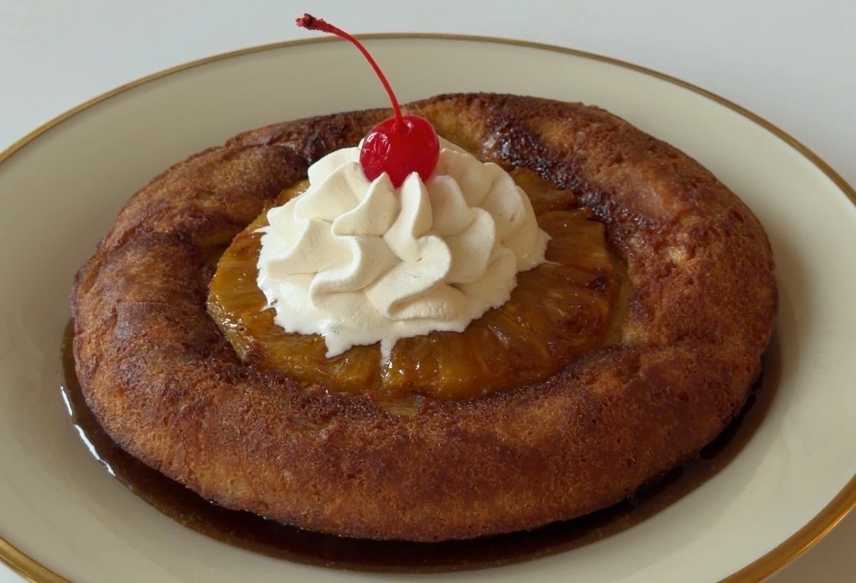 Oddly, this pancake might be even better served at room temperature rather than hot. Once it’s cooled, the toffee sauce settles in as a caramelized crust on the bottom of the pancake, making it simply irresistible. I think it’s ideally served warm, just cool enough to add some whipped cream on top while keeping the pineapple and pancake crumb soft and tender, and the sauce gooey. While I have no favorite children from the big-pan pancake series, this is Théo’s favorite. Enjoy!