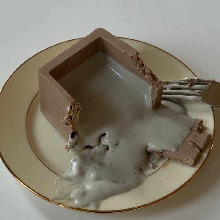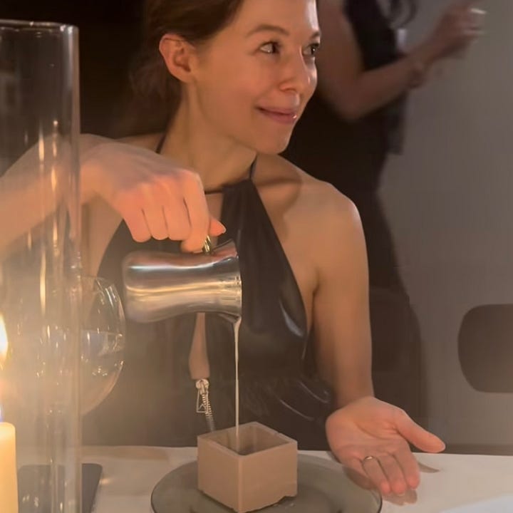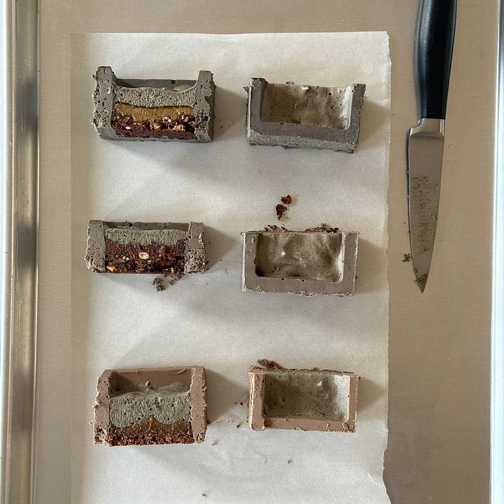 At the beginning of the month, I had the honor of making the dessert for Sotheby’s Creators & Collectors dinner. The event was held at the Breuer Building, Sotheby’s new home in NYC, and a brutalist masterpiece. My favorite detail is the variety of textures and treatments in the building’s concrete, so I incorporated the molded and poured elements of the ceiling concrete into everyone’s dessert, featuring chocolate, hazelnuts, and caramel.