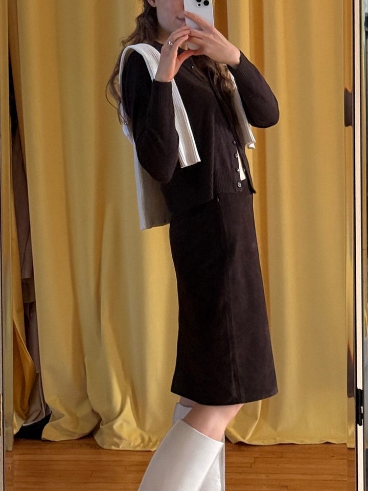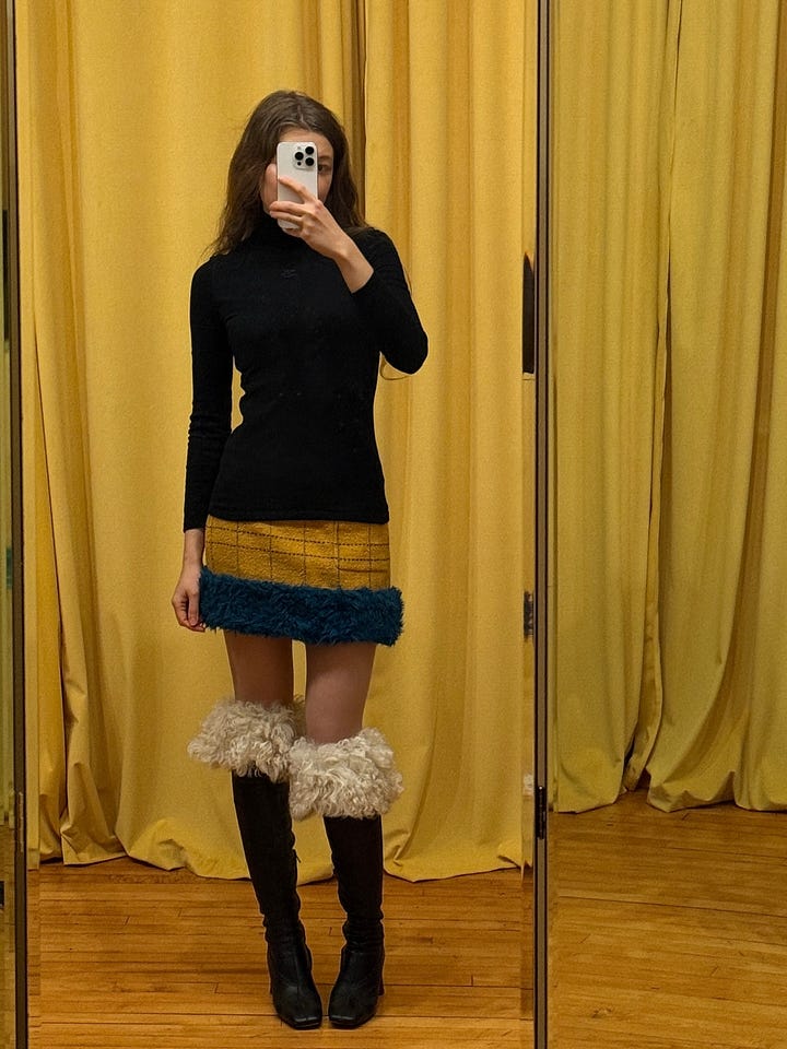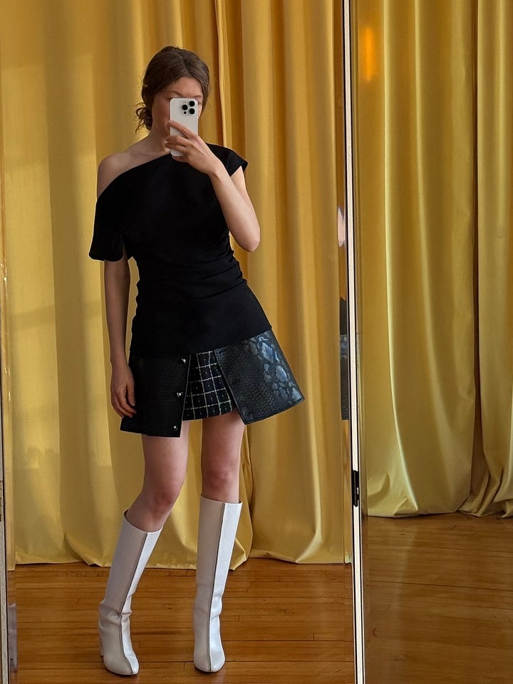 The top is 440ME and I’ve gotten so much use out of it. It’s very comfortable and flattering. The skirt is a sample from back when I used to design, and the boots are Jil Sander. I can’t find an exact match, but I have been coveting these white Jil Sander boots for ages.