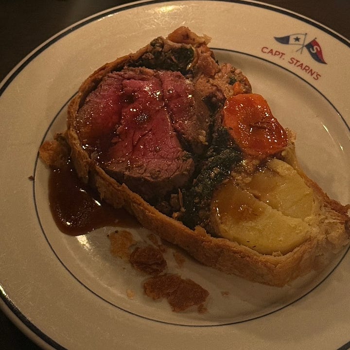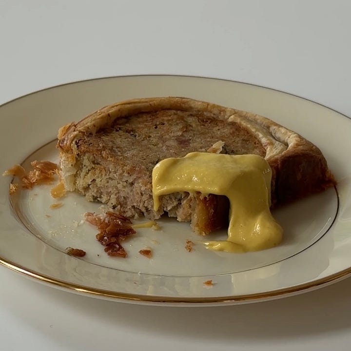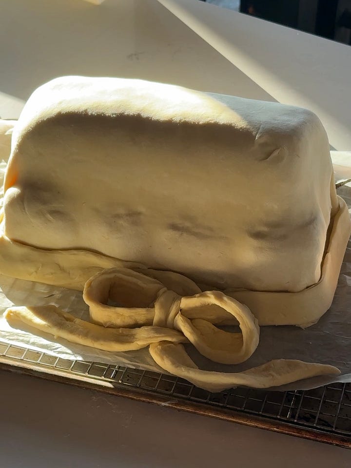 Last year, for my wedding, I made the most indulgent dish I could think of: potato gratin-stuffed Pithiviers adapted from The Pie Room by Calum Franklin (the best book for all things pie). The Pithiviers were cheesy, carby, soft, tender, and–of course–buttery. All great qualities of a holiday dish, so I knew I wanted to make it again for Christmas supper. I wasn’t sure how to incorporate it, but then Théo said he wanted to make a Beef Wellington for the main, so we combined the two. Creating a christmas supper en croute complete with: beef, potatoes, and carrots. The potatoes were sliced in half cooked in cream and aromatics and stuffed with cheese (as opposed to gratinated, i spent far too much energy being mad at myself for not keeping them whole to keep the aesthetic the same), and on the other side, roasted and braised giant carrots. The beef was prepared in a classic manner, with a layer of mushroom duxelles, spinach cooked in cream and garlic (with the leftover cream from the potatoes) all rolled up in prosciutto. I laid the potatoes and carrots on the bottom, and perched the prepared beef on top, draping the whole thing in a fresh batch of inverted puff pastry - as this assembly made the most sense for trying to get an even cook on the beef. I then simple decorated with a bow, to reference a wrapped present under the tree, and froze it overnight before baking off in the afternoon. It took far longer to bake than expected and in the process the potatoes and carrots overcooked, and because the beef was on top of the carrots and potatoes it was impossible to cut cleanly. but I do see potential here for next year - using less cooked vegetables to begin with and baking from fridge cold instead of frozen, and all the items in one layer.