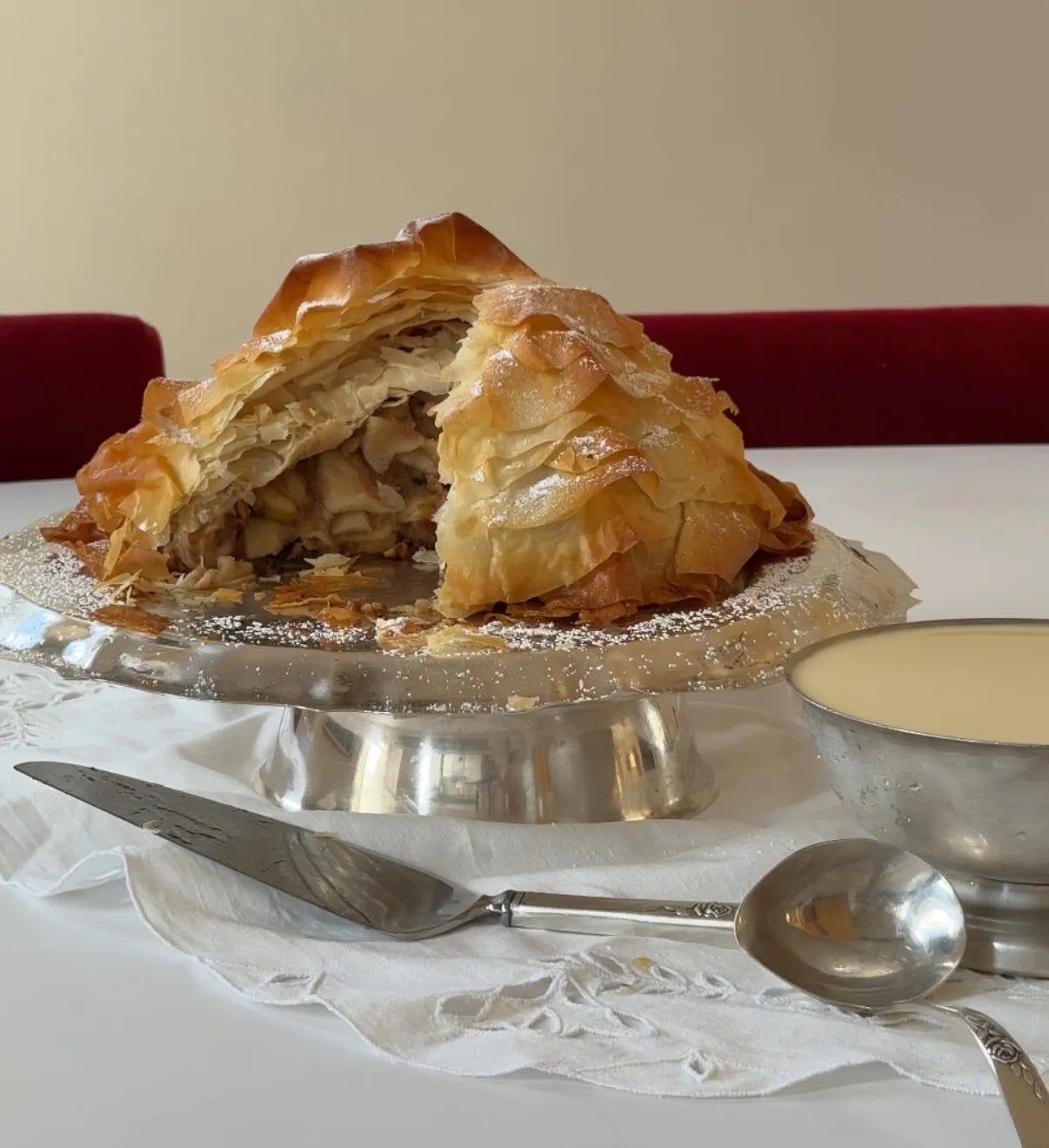 It’s super delicious too: crispy-flaky, buttery phyllo, warm, lightly spiced and sweetened brown butter-tinged apples, armagnac-soaked raisins (or cherries), and cool vanilla-y crème anglaise.