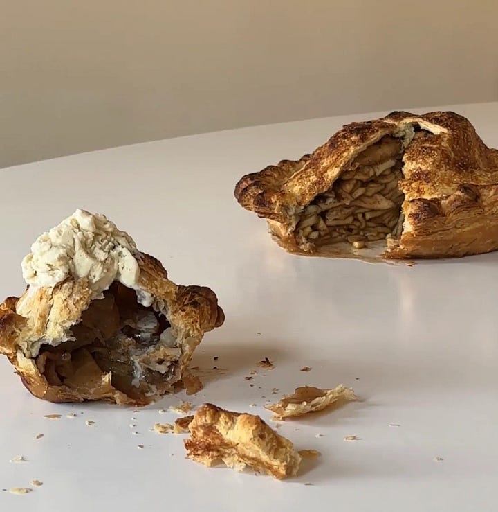 These are–admittedly–not a pie, but they really do look like mini ones, with super fall flavors and a double-crust. This recipe has all of my favorite things: apples/pears, spiced frangipane, lots of crust, anglaise, and mile-high pie aesthetics.