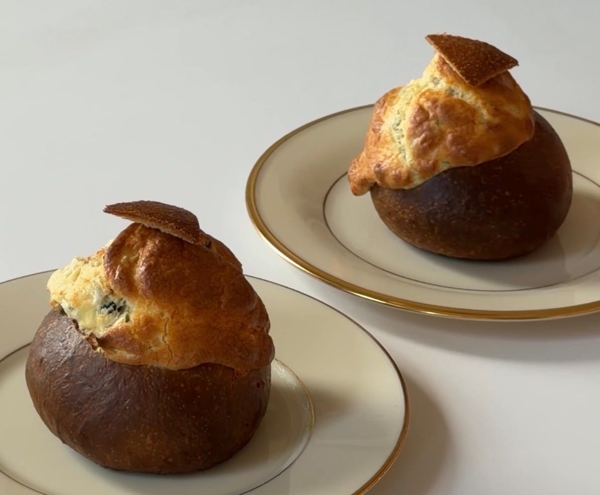 These sandwiches can be baked in a brioche or choux bun, or *could be* baked in ramekins and served with toast/baguette (for a little scoop and spread situation).