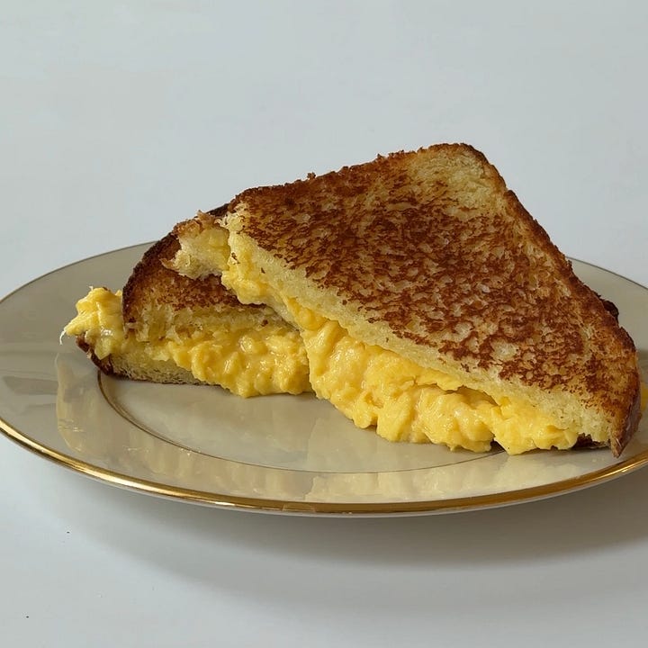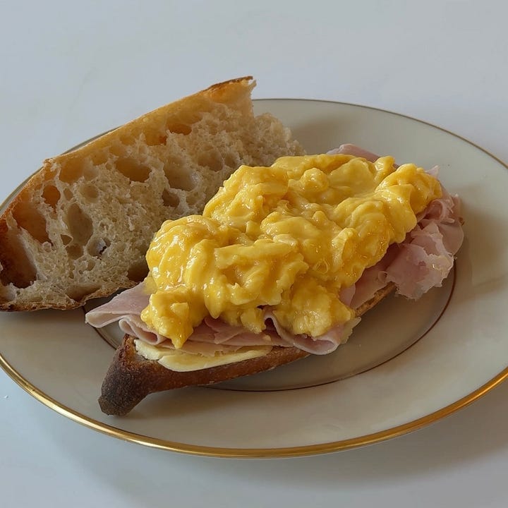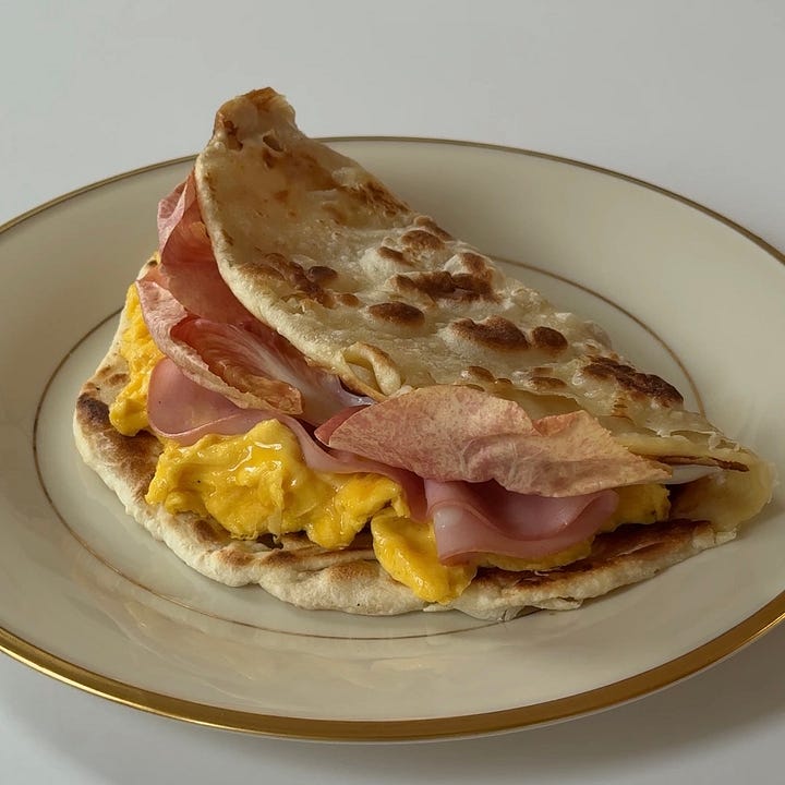By the time Théo returned, I had decided I would try to convince him how great soft scrambles are. I did this in secret – like parents sneaking vegetables into their toddler’s food, I was sneaking scrambled eggs into sandwiches. I did a grilled cheese (the Wylie Dufresne method, but with cheddar), a piadina with mortadella and radicchio (I should have added some chopped Calabrian chiles – then it would have been perfect, as mortadella already has a savory-salty-porky element without added texture or chew), a soft scramble with jambon beurre on homemade sourdough baguettes (I actually didn’t think this one would be very good, but it was a perfect combo with the custardy egg squishing into the baguette’s airy crumb structure), and of course, in a S.E.C. (sausage, egg, and cheese) featuring breakfast sausage (it’s easy and quite affordable to make your own blend if you purchase ground pork) and a sourdough english muffin (made from the same dough as the baguettes but cooked in clarified butter on the stove). Safe to say, I think I have converted him.
