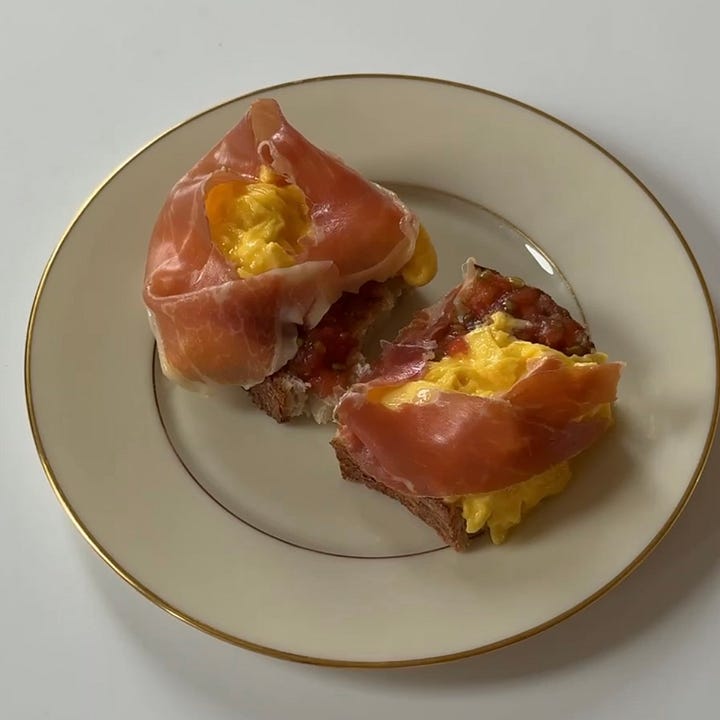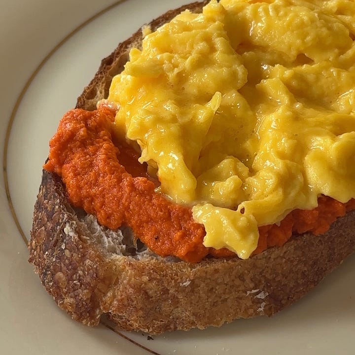 I made some truly delicious scrambled lunches this month: soft scramble with crème fraîche and chives on sourdough potato brioche-ish, pan con tomate topped with soft scramble and jamón ibérico, sourdough focaccia with arugula, soft scramble, and grated parm, and romesco spread over toast and topped simply with a soft scramble. Because all of these were made with prepared ingredients that I had on hand, each of these lunches took sub 10 minutes (some closer to 5).