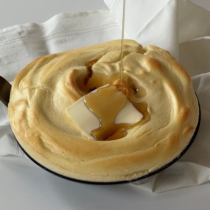 This omelette soufflé brought to mind another breakfast-classic-turned-soufflé, the pancake. This version was a skillet soufflé pancake, and I largely followed the linked recipe, but made a few adjustments (the most important being skipping the Swiss meringue step, and whipping the eggs with 15g of sugar for a lightly sweetened pancake, perfect for topping with maple syrup). This was fantastic; it really tasted like a pancake with the texture of a soufflé. Highly recommend.
