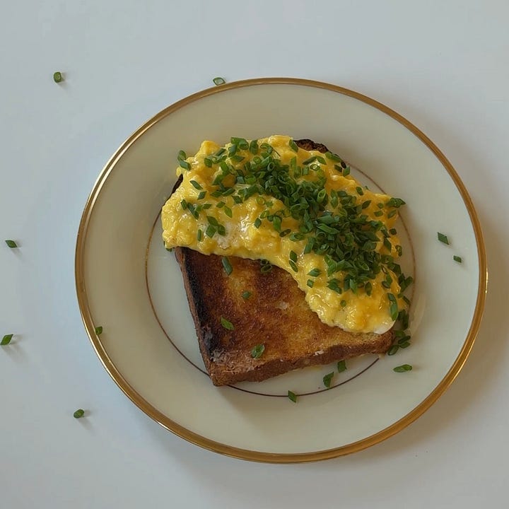 My soft scramble method of choice right now: I take 2-3 eggs, crack them into a cup with some salt (sometimes a dash of heavy cream if I want them fluffier), and then blend with an immersion blender. This takes a fraction of the time as using a fork and creates a perfectly homogenous scramble (two forks stacked on top of each other is a chef-recommended method I’ve seen, but I would rather wash one immersion blender and save a bunch of time).